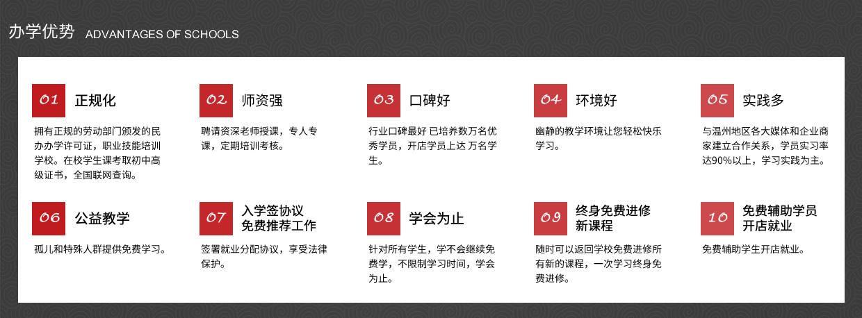 我校以培養(yǎng)實(shí)用型專業(yè)人才為目標(biāo),理論學(xué)習(xí)、操作訓(xùn)練與專業(yè)實(shí)踐三位一體,實(shí)行一對(duì)一的教學(xué)模式,常年招生,男女不限。畢業(yè)后推薦工作、 主要是以理論為輔實(shí)操為主的教學(xué)模式授課。老師手把手教、一對(duì)一輔導(dǎo),為學(xué)員量身定做課程,保證學(xué)會(huì)為止、 中途不收取任何費(fèi)用,(無(wú)任何隱形消費(fèi))進(jìn)修新的課程。、簽約教學(xué)、幫助學(xué)員開店就業(yè),免費(fèi)試學(xué)(讓您全方位的體驗(yàn)我們的專業(yè)、讓你不花一分冤枉錢。)